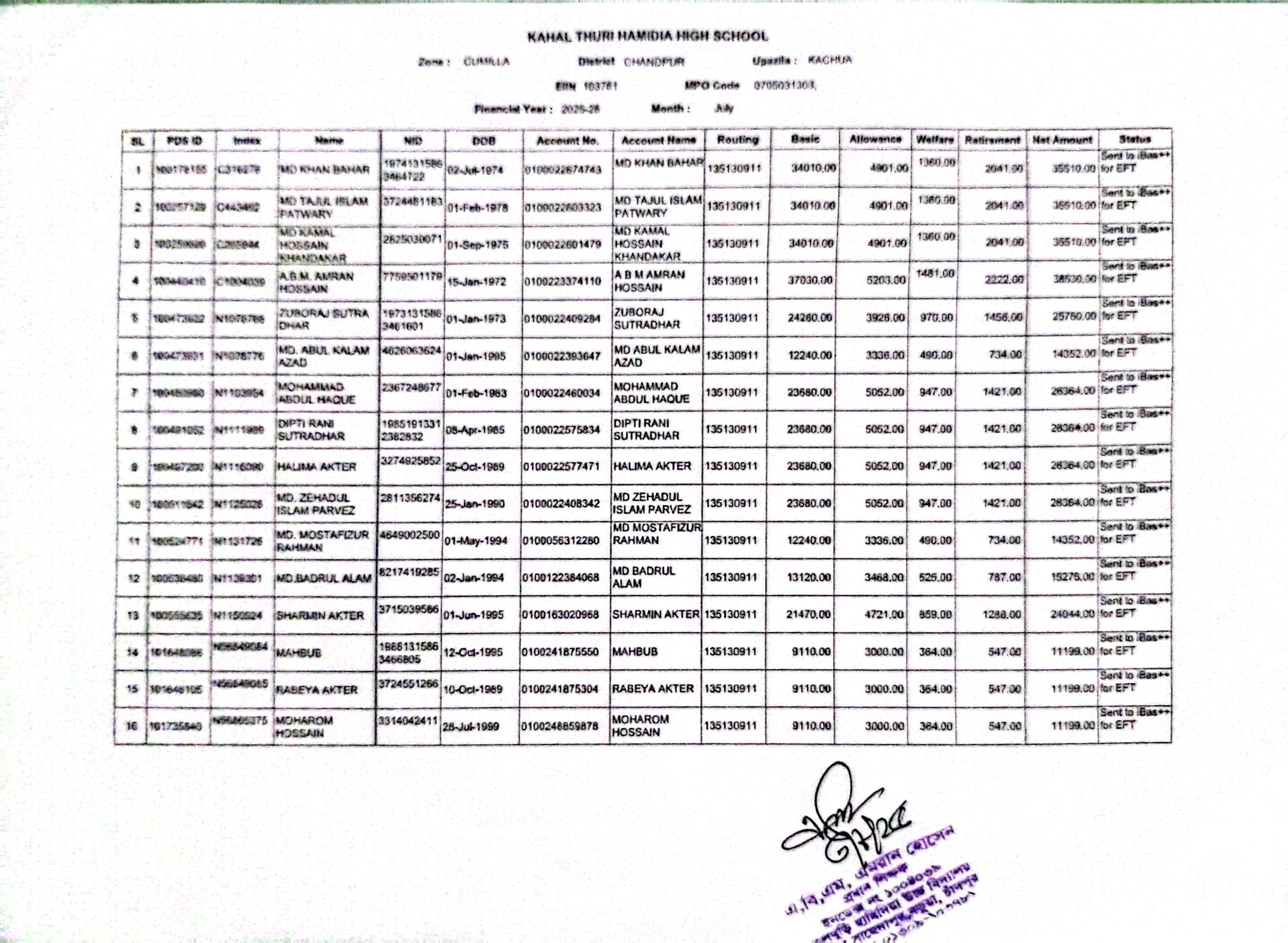 প্রতিষ্ঠানের এমপিও শীট